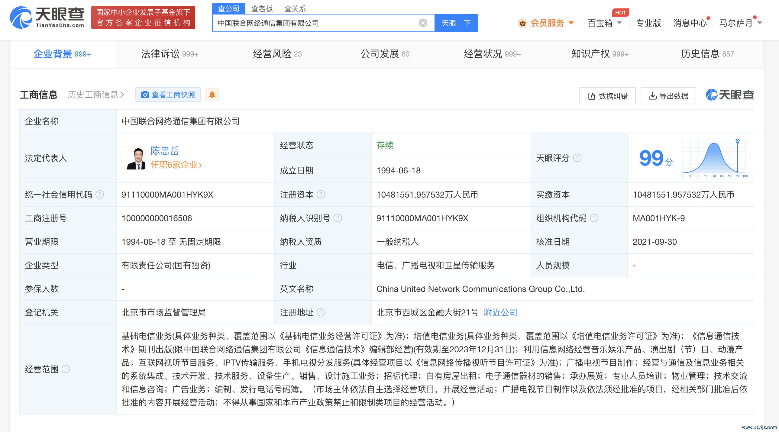 天眼查App显露,近日,中国长入集结通讯集团有限公司发生工商变更,刘烈宏卸任法定代表东谈主、董事长,由陈忠岳接任。